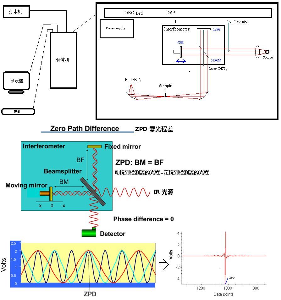 對于一個純單色光,在動鏡連續(xù)運動中將得到強度不斷變化的余弦干涉波,所以檢測器檢測到的是樣品的干涉圖,每個時刻都可得到分析光中全部波長的信息,最后樣品的干涉圖函數(shù)經(jīng)傅里葉變換后與空白時光源的強度按頻率分布的比值即得到樣品的紅外光譜圖。