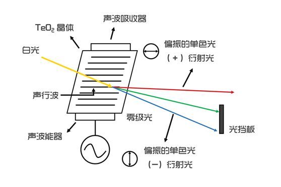 AOTF是由雙折射晶體、射頻輻射源、電聲轉換器和聲波吸收器組成。