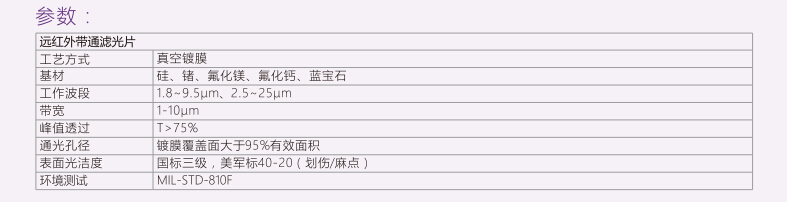 我司生產(chǎn)的遠紅外帶通濾光片中性波長一般在2.0μm~25μm范圍內(nèi),采用硅、鍺、藍寶石、氟化鎂、氟化鈣為基材鍍膜。濾光片峰值可達75%以上。