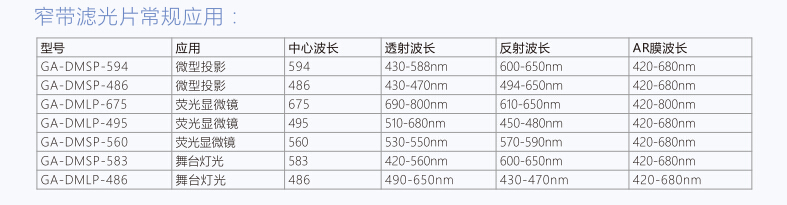 指45度入射或大角度入射時(shí),把光源分離出特定的光譜改變部分光譜光路方向,常用于酶標(biāo)儀器、熒光顯微鏡系統(tǒng)、投影光引擎系統(tǒng)、激光燈、光學(xué)儀器分束、視頻眼鏡等傳感器系統(tǒng)。是光學(xué)設(shè)計(jì)者狂熱追求的光學(xué)元件。能有效縮小器件的結(jié)構(gòu)實(shí)現(xiàn)多功能的光路。
