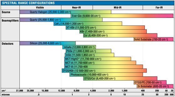 下圖列出了不同光譜儀在不同波段時采用的光源、分束器、檢測器的統(tǒng)計表。