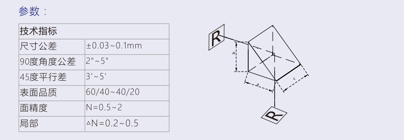直角棱鏡通常用于將光路進(jìn)行90度轉(zhuǎn)折,根據(jù)棱鏡方位,像面可被反向,而左右不發(fā)射變化。如果一個(gè)直角棱鏡旋轉(zhuǎn)90度,通過(guò)棱鏡觀察像面將會(huì)成正立的,但是左右會(huì)反向。直角棱鏡也可以用于膠合分光鏡,通過(guò)鍍分光膜可實(shí)現(xiàn)分光效果,以及偏振分光。
