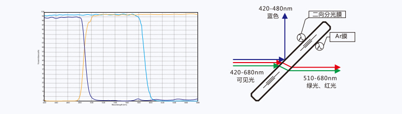 指45度入射或大角度入射時(shí),把光源分離出特定的光譜改變部分光譜光路方向,常用于酶標(biāo)儀器、熒光顯微鏡系統(tǒng)、投影光引擎系統(tǒng)、激光燈、光學(xué)儀器分束、視頻眼鏡等傳感器系統(tǒng)。是光學(xué)設(shè)計(jì)者狂熱追求的光學(xué)元件。能有效縮小器件的結(jié)構(gòu)實(shí)現(xiàn)多功能的光路。